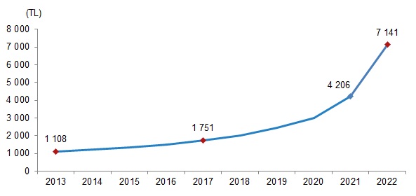 Kişi başına sağlık harcaması 2021 yılında 4 bin 206 TL iken, 2022 yılında %69,8 artarak 7 bin 141 TL'ye yükseldi.