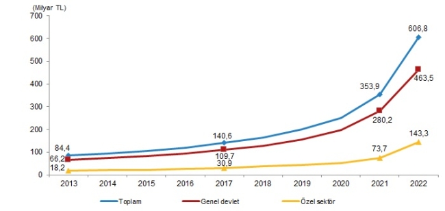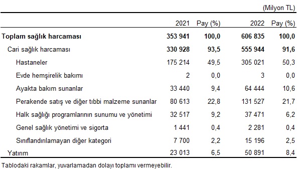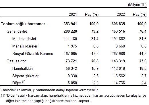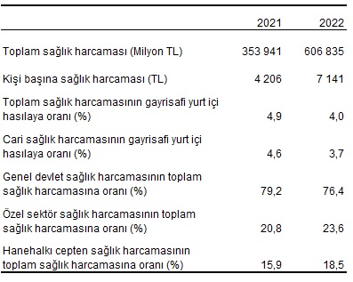 Toplam sağlık harcaması 2022 yılında bir önceki yıla göre %71,5 artarak 606 milyar 835 milyon TL'ye yükseldi. Genel devlet sağlık harcaması %65,4 artarak 463 milyar 516 milyon TL'ye ulaştı. Özel sektör sağlık harcaması ise %94,4'lük bir artış oranı ile 143 milyar 319 milyon TL olarak tahmin edildi.