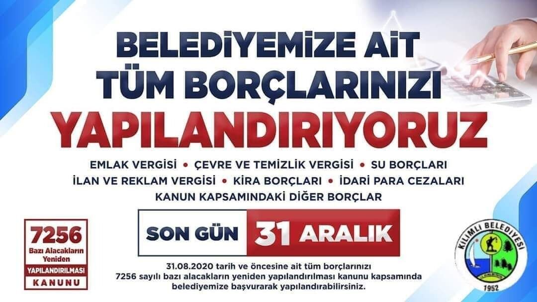 Kilimli Belediyesi, vatandaşların Belediyeye olan emlak, çevre temizlik vergisi, su borçları, ilan ve reklam vergisi, kira borçları ve kanun kapsamındaki diğer borçlarıhı yapılandırıyor. Yapılandırma için son gün 31 Aralık olup belediyeden yapılan açıklamada: "7256 Bazı Alacakların Yeniden YAPILANDIRILMASI KANUNU 31.08.2020 tarih ve öncesine ait tüm borçlarınızı 7256 sayılı bazı alacakların yeniden yapılandırılması kanunu kapsamında belediyemize başvurarak yapılandırabilirsiniz'denildi.