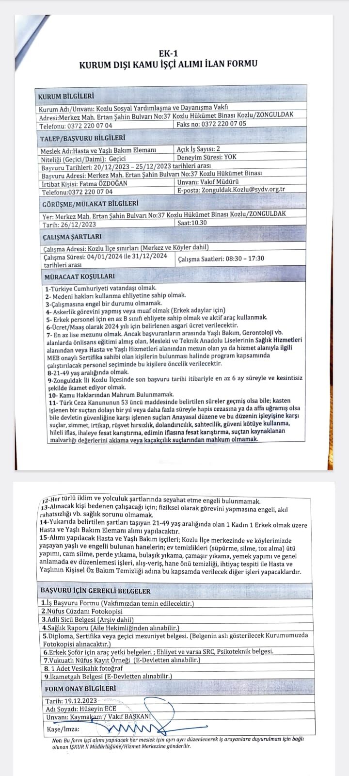 Kozlu Sosyal Yardımlaşma ve Dayanışma Vakfına 2 hasta ve yaşlı bakım elemanı alınacak. Başvurular 20-25 Aralık 2023 tarihinde vakfa yapılacak.Müracaat koşulları:1-Türkiye Cumhuriyeti vatandaşı olmak.2- Medeni hakları kullanma ehliyetine sahip olmak.3-Çalışmasına engel bir durumu olmamak.4- Askerlik görevini yapmış veya muaf olmak (Erkek adaylar için)5- Erkek personel için en az B sınıfı ehliyete sahip olmak ve aktif araç kullanmak.6-Ücret/Maaş olarak 2024 yılı için belirlenen asgari ücret verilecektir.7- En az lise mezunu olmak. Ancak başvuranların arasında Yaşlı Bakım, Gerontoloji vb.alanlarda önlisans eğitimi almış olan, Mesleki ve Teknik Anadolu Liselerinin Sağlık Hizmetleri alanından veya Hasta ve Yaşlı Hizmetleri alanından mezun olan ya da hizmet alanıyla ilgili MEB onaylı Sertifika sahibi olan kişilerin bulunması halinde program kapsamında çalıştırılacak personel seçiminde bu kişilere öncelik verilecektir.8-21-49 yaş aralığında olmak.9-Zonguldak Ili kozlu İlçesinde son başvuru tarihi itibariyle en az 6 ay süreyle ve kesintisiz şekilde ikamet ediyor olmak.10- Kamu Haklarından Mahrum Bulunmamak.11- Türk Ceza Kanununun 53 üncü maddesinde belirtilen süreler geçmiş olsa bile; kasten işlenen bir suçtan dolayı bir yıl veya daha fazla süreyle hapis cezasına ya da affa uğramış olsa bile devletin güvenliğine karşı işlenen suçları Anayasal düzene ve bu düzenin işleyişine karşı suçlar, zimmet, irtikap, rüşvet hırsızlık, dolandırıcılık, sahtecilik, güveni kötüye kullanma, hileli iflas, ihaleye fesat karıştırma, edimin iflasına fesat karıştırma, suçtan kaynaklanan malvarlığı değerlerini aklama veya kaçakçılık suçlarından mahkum olmamak.12-Her türlü iklim ve yolculuk şartlarında seyahat etme engeli bulunmamak. 13-Alınacak kişi bedenen çalışacağı için; fiziksel olarak görevini yapmasına engeli, akıl rahatsızlığı vb. sağlık sorunu olmamak.14-Yukarıda belirtilen şartları taşıyan 21-49 yaş aralığında olan 1 Kadın 1 Erkek olmak üzere Hasta ve Yaşlı Bakım Elemanı alımı yapılacaktır.15-Alımı yapılacak Hasta ve Yaşlı Bakım işçileri; Kozlu İlçe merkezinde ve köylerimizde yaşayan yaşlı ve engelli bulunan hanelerin; ev temizlikleri (süpürme, silme, toz alma) ütü yapımı, cam silme, perde yıkama, bulaşık yıkama, çamaşır yıkama, yemek yapımı ve genel anlamada ev düzenlemesi işleri, alış-veriş, hane önü temizliği, ihtiyaç tespiti ile Hasta ve Yaşlının Kişisel Öz Bakım Temizliği adına bu kapsamda verilecek diğer işleri yapacaklardır.