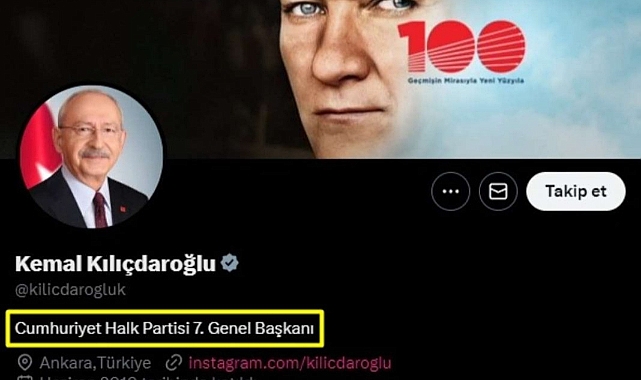 Kemal Kılıçdaroğlu, partisinin 38.Olağan Kurultayının ardından, sosyal medya profilindeki “Cumhuriyet Halk Partisi Genel Başkanı” ifadesini, “Cumhuriyet Halk Partisi 7. Genel Başkanı” olarak değiştirdi.CHP 38. Olağan Kurultayı’nda 81 ilden gelen 1367 kurultay delegesi, Cumhuriyetin ve partinin 100. yılında yeni genel başkanı ve yeni parti yönetimini seçti. CHP’nin yeni genel başkanı Özgür Özel oldu.Kemal Kılıçdaroğlu, sosyal medya platformu X’te (Twitter) biyografi kısmını güncelledi.Kılıçdaroğlu, “Cumhuriyet Halk Partisi Genel Başkanı” ifadesini, “Cumhuriyet Halk Partisi 7. Genel Başkanı” olarak düzeltti.