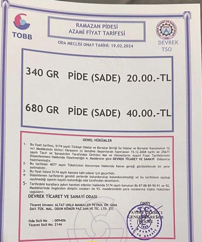 Devrek TSO meclisinde alınan karara göre bu yıl 340 gram sade pide fiyatı 20 TL, 680 gram sade pide fiyatı 40 TL olarak belirlendi.