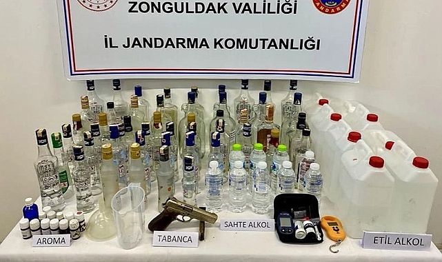 Zonguldak İl Jandarma Komutanlığı ekiplerince yılbaşı tedbirleri kapsamında, adli makamlardan alınan arama kararına istinaden Alaplıilçesi mülki sınırları içerisinde 1 şahsa ait ev ve eklentilerinde yapılan aramada; 30 litre etil alkol, 12 adet muhtelif boyutlarda şişe içerisinde sahte alkol,13 adet sahte alkol üretiminde kullanılan aroma maddesi, 68 adet muhtelif boyutlarda cam şişe, 3 adet sahte alkol üretiminde kullanılan aparat,1 adet hassas terazi, 1 adet 9 mm çapında ruhsatsız tabanca ele geçirildi.Olayla ilgili Cumhuriyet Başsavcılığının talimatları doğrultusunda şüpheli şahıs hakkında adli işlem yapıldı.