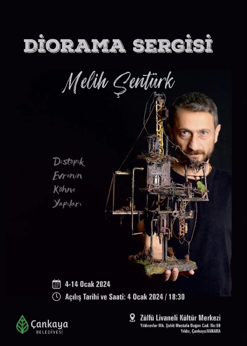 Çankaya Belediyesi Zülfü Livaneli Kültür Merkezi, Zonguldaklı Sanatçı Melih Şentürk’ün eserlerinden oluşan diorama sergisine ev sahipliği yapmaya hazırlanıyor.Çankaya Belediyesi Zülfü Livaneli Kültür Merkezi, Diorama Sanatçısı Melih Şentürk’ün Diorama sergisine 4-14 Ocak 2024 tarihleri arasında ev sahipliği yapacak. Sergi açılışı 4 Ocak Perşembe günü saat:18.30’da.Diorama Sanatçısı Melih Şentürk, distopik evrenin köhne yapılarını eserlerine yansıttığından söz ederek şunları aktardı: "Gelecek yüz yıllar içerisinde oluşmuş distopik bir evrenin köhne yapılarını diorama sanatı ile birleştirmeye çalışıyorum. Bunlar; insanoğlunun doğanın dengesini bozacak kadar ona zarar vermesi hatta sömürmesi sonucu ortaya çıkan belki yıkımlar, belki salgın hastalıklar nedeni ile çok az sayıda hayatta kalabilmeyi başarmış bir grup insanın yaşamını sürdürebilmesi için çevresindeki her türlü imkanları, hurdaları kullanarak inşa ettikleri barınaklar diyebiliriz.Aslında kötü gibi görünen bu dünya bana göre bambaşka yeni güzel bir başlangıç. Hayatta kalan insanların uyanışı, bir tek küçük ağacın bile ne kadar kıymetli olduğunu, bir bardak temiz suyun nasıl değerli olduğunu, karnını doyurabilmenin daha önce ne kadar sıradan fakat şimdi bir tane meyvenin bile bir madenden daha değerli olduğunu anladığı, uyanışla dolu bir dünyayı anlatmaya çalışıyorum."