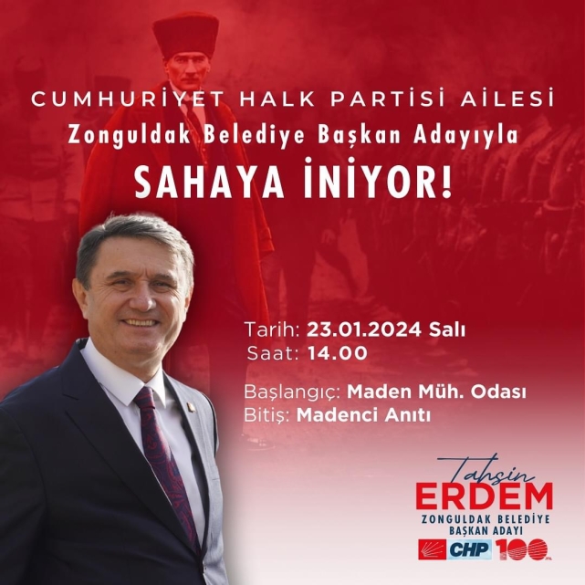 “Sevgili Cumhuriyet Halk Partisi Ailesi, Şehrimiz için yeni bir başlangıç yapmak üzere adım atmaya hazırlanıyoruz. Sizleri de bu önemli günümüzde yanımızda görmekten büyük onur duyarız. 23 Ocak 2024 Salı günü saat 14.00’te, Maden Mühendisleri Odası’ndan (Maden Mühendisleri Derneği Lokali) başlayarak, Mandenciler Anıtı’na kadar sürecek olan yürüyüşümüze katılın, Zonguldak’ımız için hep birlikte yürüyelim. Bu yolculukta sizlerin desteğiyle Zonguldak için somut adımlar atacak, şehrimizi huzur, adalet ve refah dolu bir geleceğe taşıyacağız."