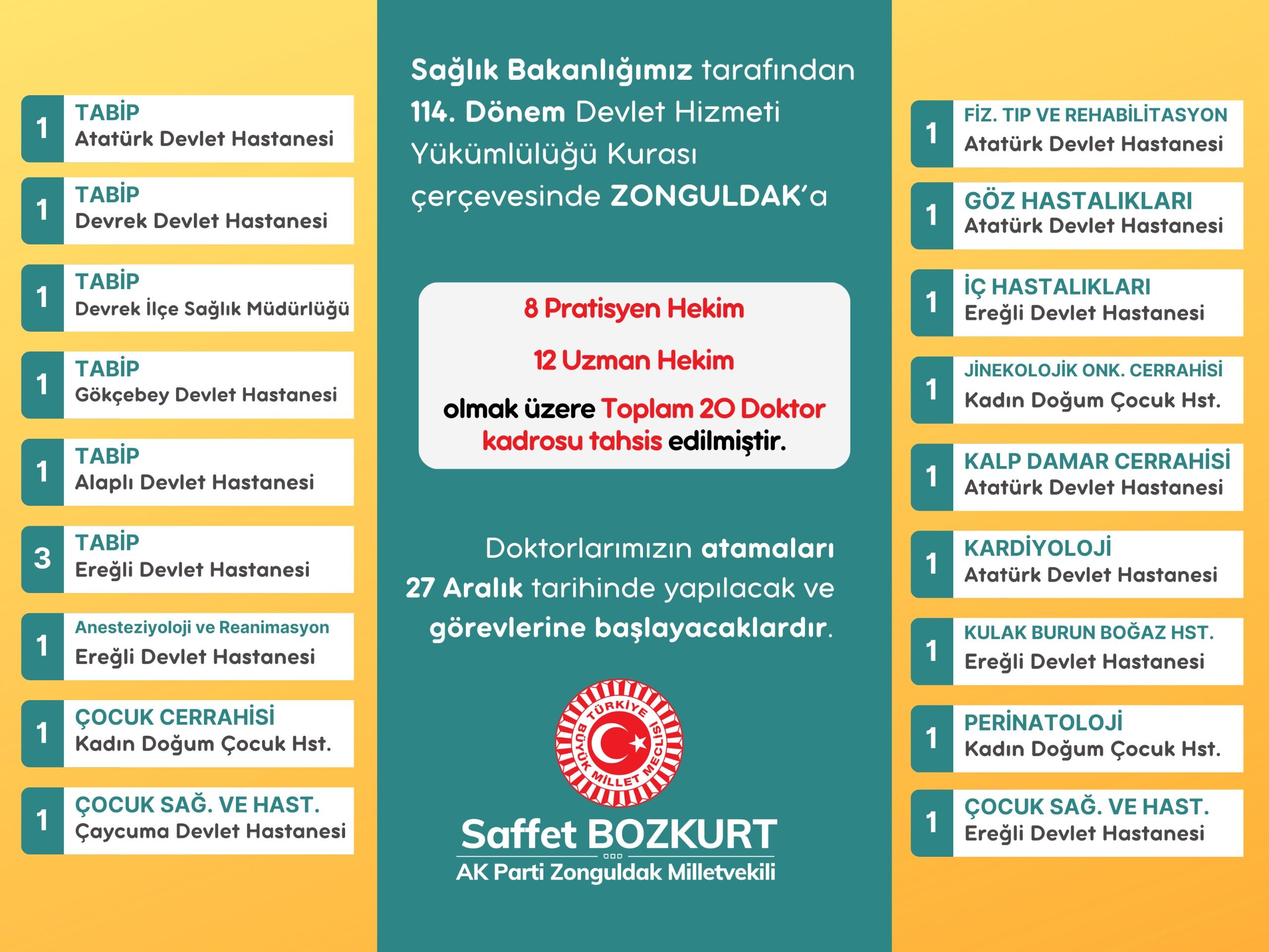 Zonguldak'a atanan 20 doktorun 27 Aralık'ta görevlerine başlayacağını açıklayan Ak Parti zonguldak Milletvekili Saffet Bozkurt: "Sağlık Bakanlığımız tarafından 114. Dönem Devlet Hizmeti Yükümlülüğü Kurası çerçevesinde ZONGULDAK’a 8 Pratisyen Hekim 12 Uzman Hekim olmak üzere Toplam 20 doktor kadrosu tahsis edilmiştir. Doktorlarımızın atamaları 27 Aralık tarihinde yapılacak ve görevlerine başlayacaklardır."